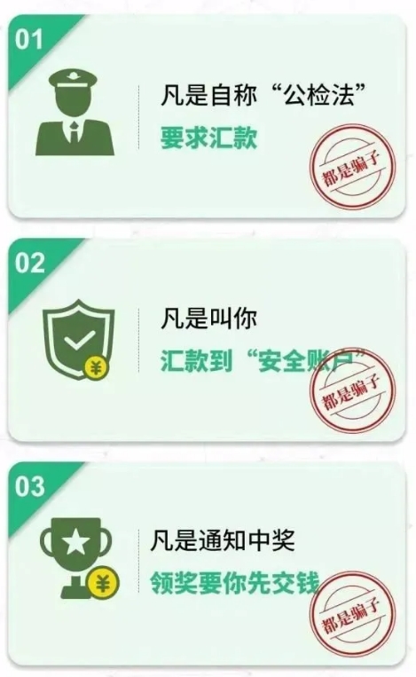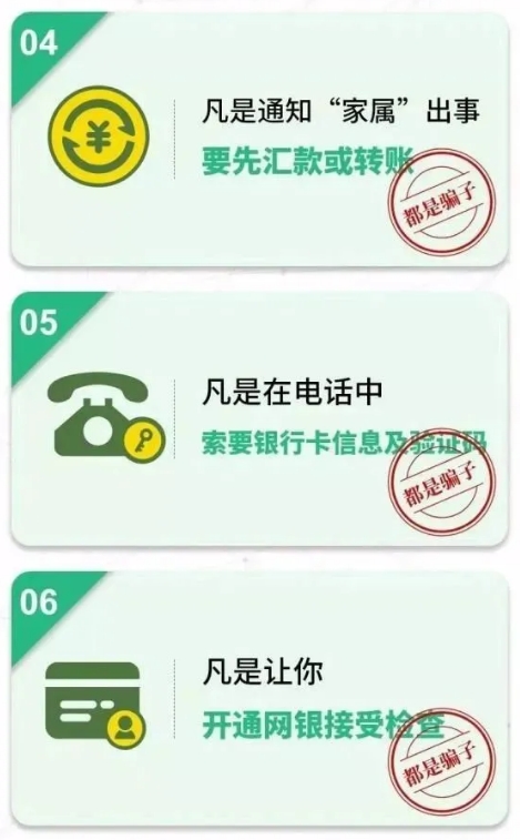 (3)凡是自稱公檢法機(jī)關(guān)或醫(yī)保局等部門,以涉嫌嚴(yán)重違法犯罪并需要保密等為由,索要銀行卡信息及密碼、驗(yàn)證碼進(jìn)行“資金清算”或者讓你直接把錢打到所謂的“安全賬戶”的。