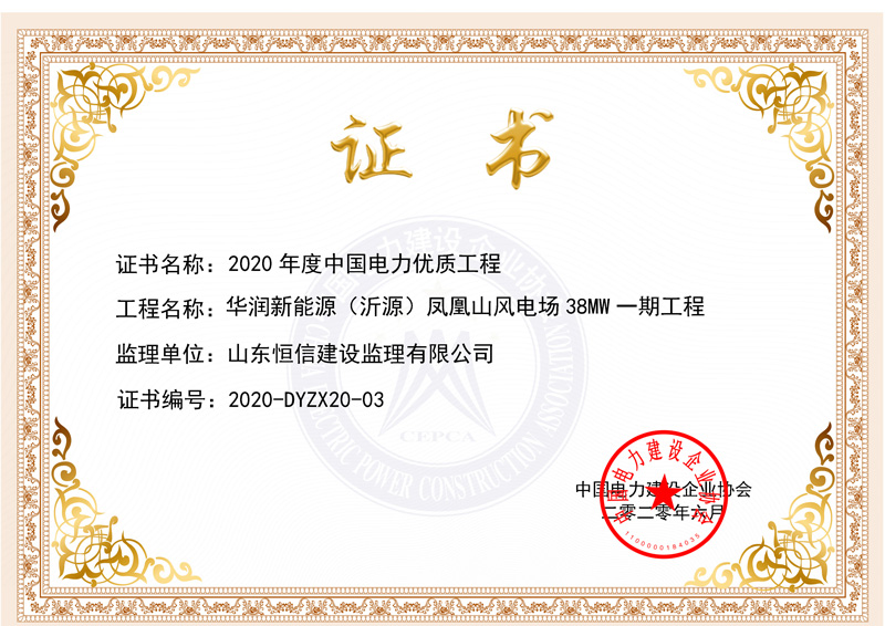 公司榮獲:華潤新能源(沂源)鳳凰山風(fēng)電場 38MW 一期工程:2020 年度中國電力優(yōu)質(zhì)工程